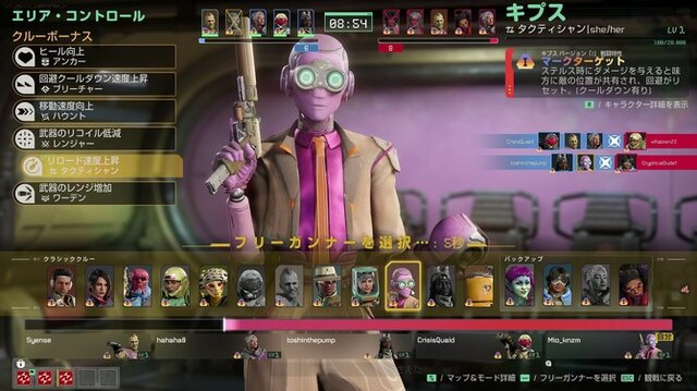 キャラはリスポーン時に毎回選び直すことができるので、相手の編成を見て変えることは非常に重要。ロールを選ぶと次回リスポーン時に適用される「クルーボーナス」というバフもリロード速度上昇や移動速度上昇などキャラごとの弱点も埋められます。