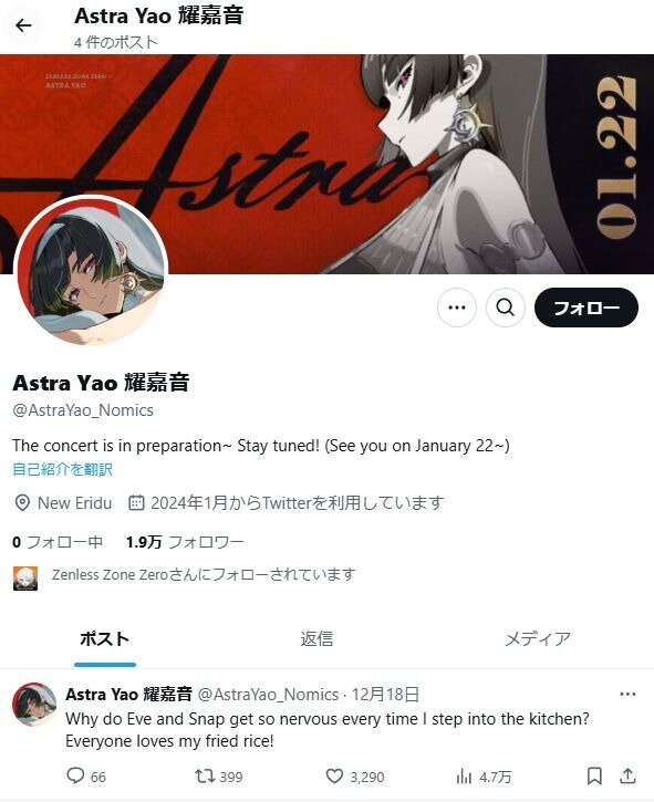 そんな彼女ですが、まるで本人が運用しているかに見える英語アカウントがXにて、12月15日から投稿を開始しました。執筆時点で本アカウントは海外『ゼンレスゾーンゼロ』公式アカウントにフォローされており、歌姫というキャラクター性になぞらえてか、コンサートに関する言及やピアノを弾く様子などを投稿。