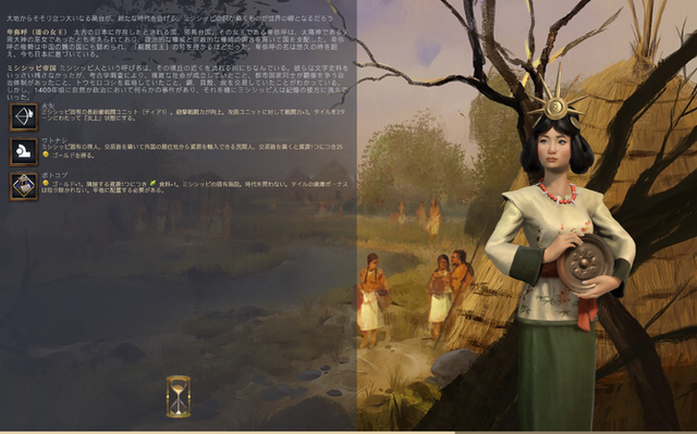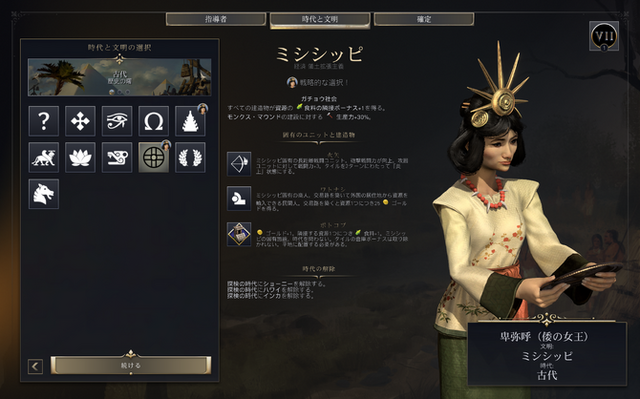 メディア向けイベントで体験できたのはリリース版に近いビルド。指導者は19人の中から選ぶことができ、その中には日本の卑弥呼の姿がありました。今回は卑弥呼におすすめとなっていた「ミシシッピ」文明でスタート。ちなみにもうひとつのおすすめ文明はクメールだったのですが、「漢」ではなく「クメール」と「ミシシッピ」がおすすめになっているのかは謎です。