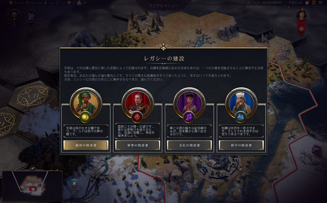 本作のレガシーパス(勝利への道)は、科学、経済、文化、軍事の4種類があり、プレイヤー自身によって目的を選ぶことができます。例えば軍事を選ぶと、周りの全ての都市を征服していくことが目的となります。そうやって自分で選んだ目的に沿ってゲームを進めていくと様々な要素がアンロックされ、次の時代にも固有能力を持ち越すことができます。