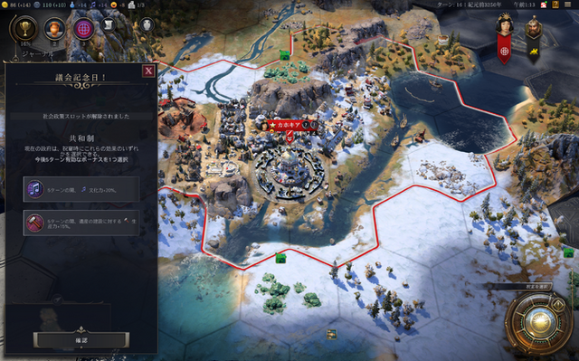 政府を樹立すると社会政策を制定できるようになります。その後は、川や海など水場が近くにある地形で居住地を発展させていくことや、「斥候」でマップを切り拓いていき、「戦士」などで敵対勢力から守りを固めつつ進めていく流れは前作同様です。