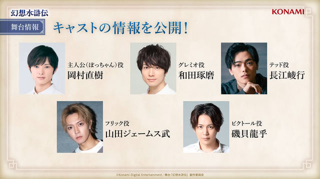 脚本・演出は多数の舞台作品で知られる中屋敷法仁氏が務め、主人公(ぼっちゃん)に岡村直樹さん、グレミオ役に和田琢磨さん、テッド役に長江崚行さん、フリック役に山田ジェームス武さん、ビクトール役に磯貝龍乎さんといった一部キャストも明らかになりました。
