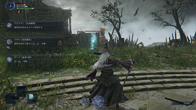 THE・魔法使いな性能の「隠者」は、魔術や祈祷を使って戦うキャラクターです。本作にはFPの回復手段である「青雫の聖杯瓶」がないのですが、代わりに、敵に攻撃したさいに付与される「属性痕」を吸収するスキルを使うことでFPを回復することができます。属性痕を3つ吸収すると、その属性の組み合わせによって異なる強力な魔法を放つことも。