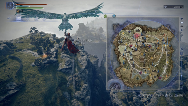 キャラクターを決めたら、いよいよフィールドに赴きます。フィールドはある程度の大きさのシームレスなマップになっており、プレイヤーはあらかじめ定められた地点まで霊鳥で飛ぶことで探索を開始します。
