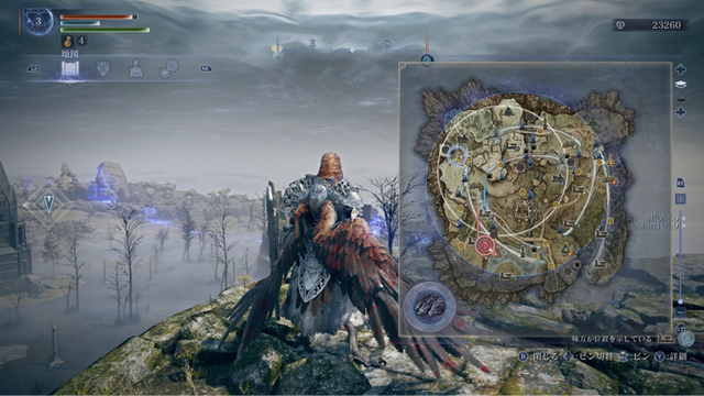 マップ画面を開くと、フィールド上にある施設の場所をみることができます。鍛石が入手できる坑道や、敵が闊歩する拠点、聖杯瓶の上限を増やせる教会の場所などが表示されており、今必要な強化に合わせて目的地を定めます。ピンを打ってそこへ向かい、チームで協力してその場所を制圧したり、そこにいるボスを倒したりしながら、新たな武器やアイテムの入手、レベルアップを目指していきます。