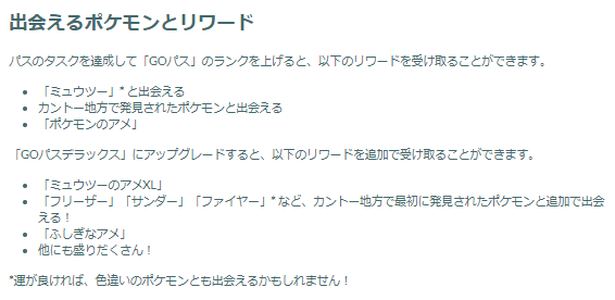イベントが始まると、無料で楽しめる期間限定のGOパスが手に入ります。GOパスはミッションをクリアする毎にGOポイントが手に入り、それに応じたリワード報酬を受け取る事が出来ます。