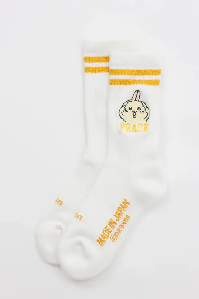 そのほかにも、ピースなリラックスウェアが展開。ちいかわたちのカレッジ風プリントがポイントのTシャツ、スウェット、ソックスを取り揃えており、セットアップでも使えます。