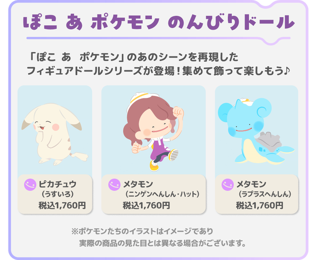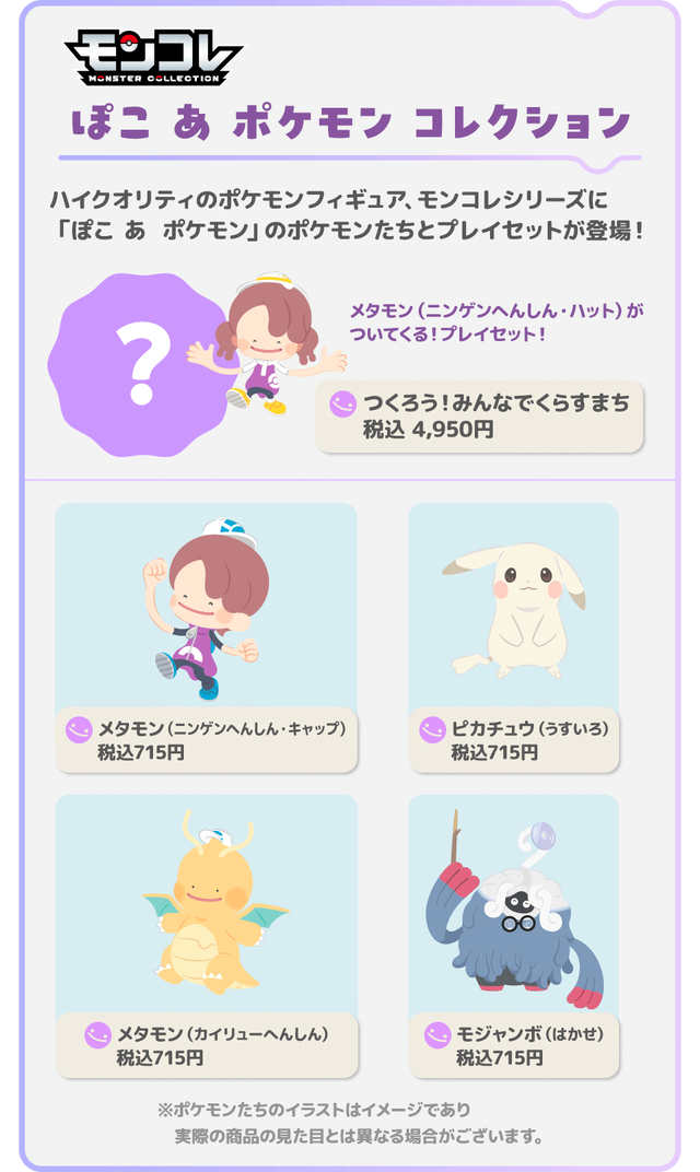モンコレはプレイセット「つくろ!みんなでくらすまち」のほか、「メタモン(ニンゲンへんしん・キャップ)」や「ピカチュウ(うすいろ)」など全5商品。のんびりドールはメタモン(ラプラスへんしん)を含めた全3商品、計8商品が登場します。