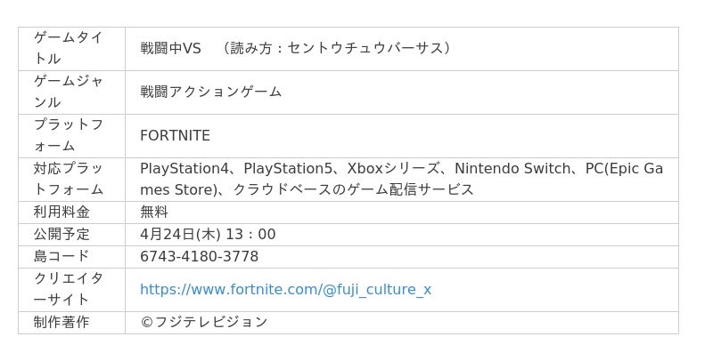 株式会社Fuji Culture X(本社:東京都江東区、代表取締役:久恒 賢治)とAlche株式会社(本社:東京都渋谷区、代表取締役:川大揮、以下当社)は共同で、Epic Gamesが提供する人気オンラインゲーム「FORTNITE(フォートナイト)」において、フジテレビのTV番組「戦闘中」のゲーム『戦闘中VS』を、4月24日(木)13:00より配信を開始したことをお知らせいたします。