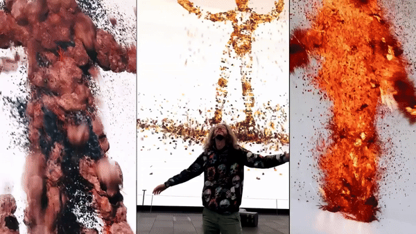 リアルタイムに中央の人物が巨人を動かしている様子。