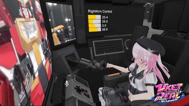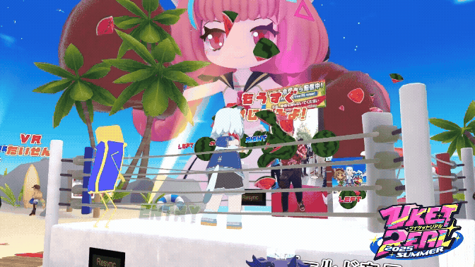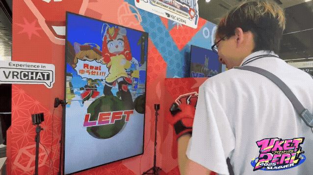 バーチャルとリアルで対戦する次世代体感型ゲームの「V決闘」では、VRCボクシングとコラボ。リアルではボクシンググローブ型のコントローラーでパンチしてスイカを割り、バーチャル側の参加者と競い合いました。「爽快すぎてクセになる」「友達と盛り上がった」と人気を博し、秋葉原の町を散策する観光客の目にも留まり、会場を大いに盛り上げました。