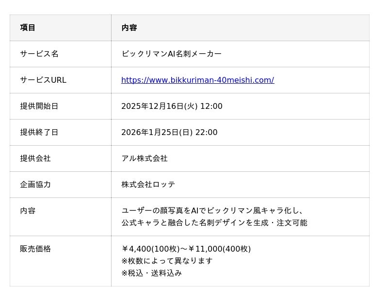 株式会社ロッテ(東京都新宿区、代表取締役社長執行役員:中島英樹、以下ロッテ)は、アル株式会社(本社:東京都渋谷区、代表取締役:古川健介、以下アル)と共同でビックリマン悪魔VS天使シリーズの40周年を記念して開発した、生成AIサービス 「ビックリマンAI名刺メーカー」 を2025年12月16日(火)から40日間限定で提供開始いたします。