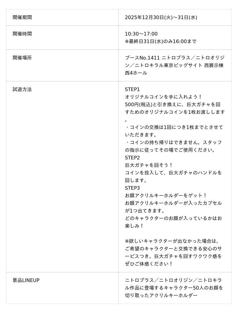 景品として、ニトロプラス/ニトロオリジン/ニトロキラル作品に登場するキャラクター50人のお顔を切り取ったアクリルキーホルダーがもらえます。欲しいキャラクターが出なかった場合は、ご希望のキャラクターと交換できる安心のサービスつきです。2025年12月で開催50周年を迎えるコミックマーケットを盛り上げます。