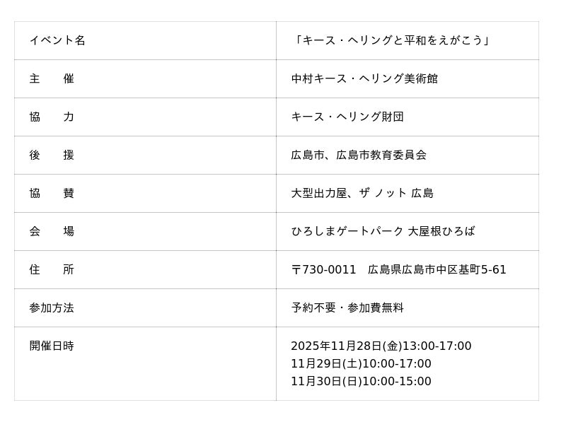 中村キース・ヘリング美術館(山梨県・小淵沢)は、2025年11月に広島市で開催した特別イベント「キース・ヘリングと平和をえがこう」の記録映像を、このたび公開しました。本イベントは、1988年に広島を訪れたキース・ヘリングが遺した平和への思いを、次世代へとつなぐプロジェクトの一環として実施したものです。映像では、イベント期間中に行われたワークショップに焦点を当てます。約250人の子どもたち一人ひとりが、マーカーやカラーシートを手にバナーに向き合う姿や、完成に向かって作品が変化していく過程をご覧いただけます。戦後80年の広島において、子どもたちの自由な発想で鮮やかに描き出される「平和」の姿を捉え、伝える映像です。