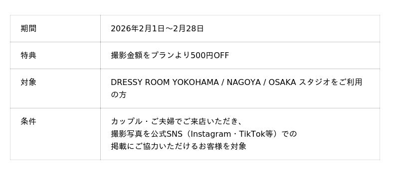 セルフ写真館 PICmiiは、カメラ専門店「カメラのキタムラ」のグループ会社として、撮影画質の仕上がりにこだわったセルフ写真館で、個室での自由な撮影をお楽しみいただけます。DRESSY ROOM YOKOHAMA/NAGOYA/OSAKAスタジオでは、2月限定で『バレンタインフォト割』を実施。2/1~2/28の期間、カップル・ご夫婦でご来店いただき、撮影写真を公式SNS(Instagram・TikTok等)での掲載にご協力いただけるお客様を対象に、ご利用料金より500円OFFとさせていただきます。(記事を見た旨をお伝えください。)