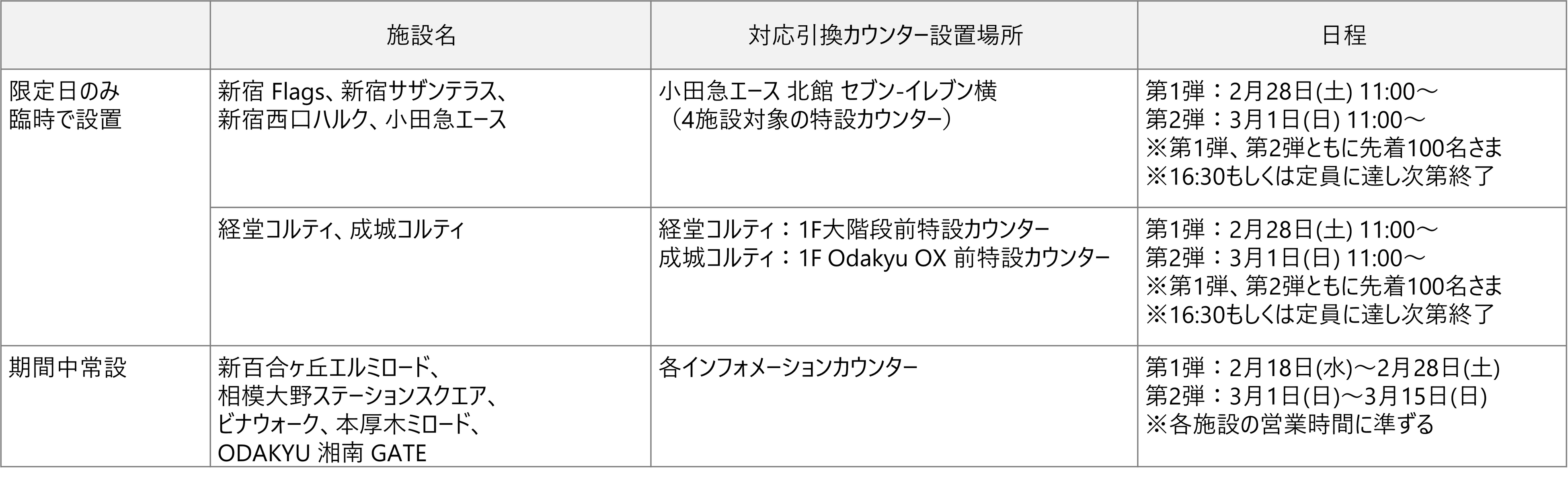 場所:11施設(新宿 Flags、新宿サザンテラス、新宿西口ハルク、小田急エース、経堂コルティ、成城コルティ、新百合ヶ丘エルミロード、相模大野ステーションスクエア、ビナウォーク、本厚木ミロード、ODAKYU 湘南 GATE)