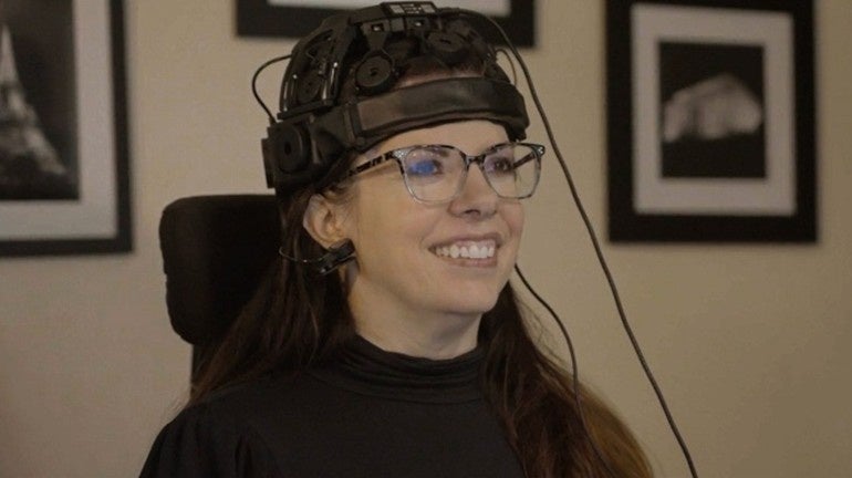 18個のドライEEG電極を備えるヘッドセット型脳波計でブレアナさんの脳波を計測。ブレアナさんの「左手を握る」「右手を握る」といった脳内での運動のイメージに対する脳波のパターンを機械学習により検知することで、デジタル上のアバターの動きをリアルタイムに変化させることを実現。さらにNTT独自の脳波技術により、ブレアナさんの緊張・集中といった精神状態や発汗などの身体状態によって時々刻々と変化する脳波の特徴を捉えて機械学習モデルをパーソナライズすることで、正確に運動イメージを検知することに成功しました。