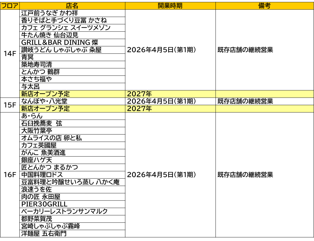 開業スケジュールについて第1期|2026年4月5日(日)開業 ※13F~16Fの継続店舗のみ営業