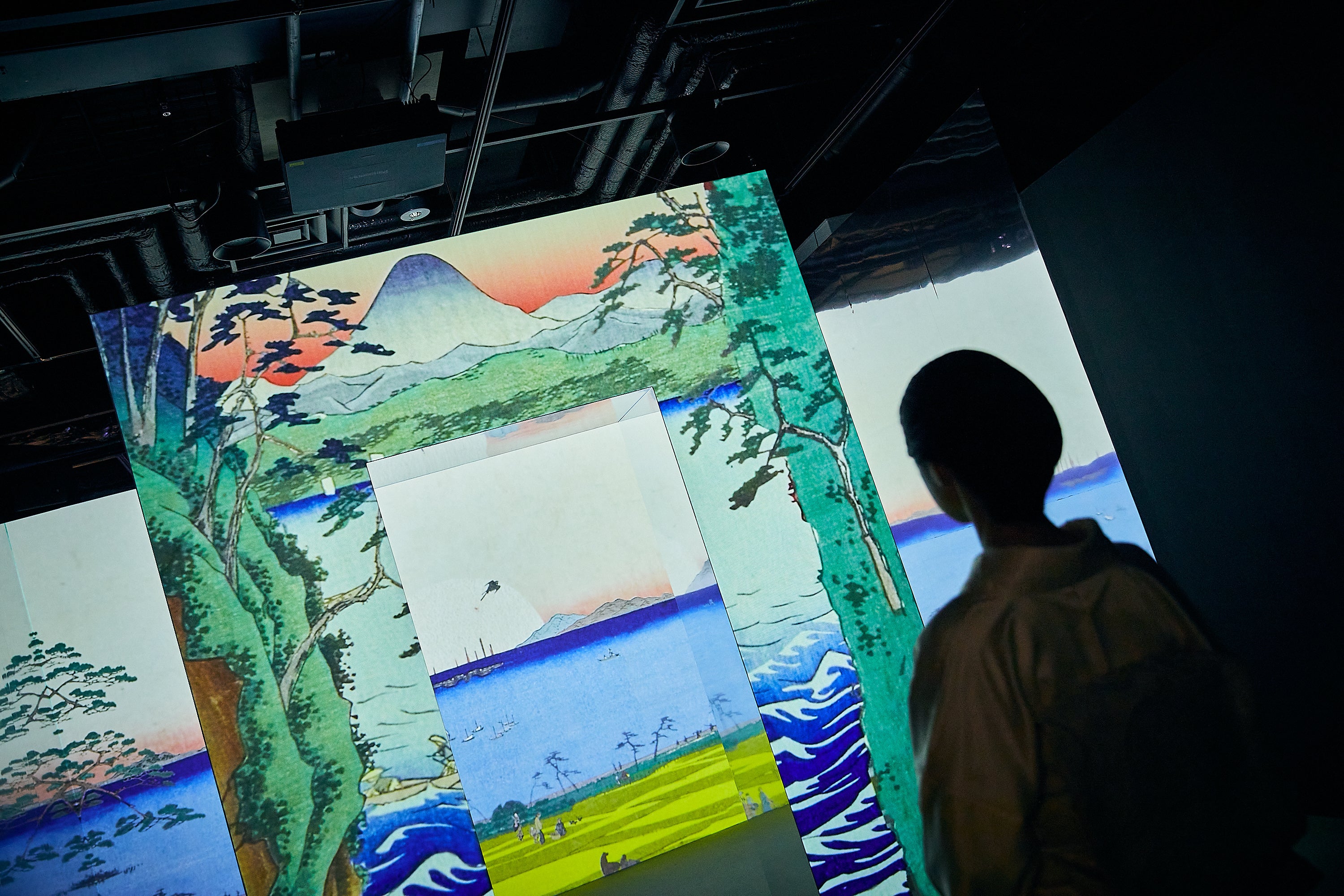 「動き出す浮世絵展」は、葛飾北斎、歌川国芳、歌川広重、喜多川歌麿、東洲斎写楽、歌川国貞など世界的な浮世絵師の作品300点以上をもとに、3DCGアニメーションやプロジェクションマッピングを駆使して大人から子どもまで楽しめるグラフィカルなデジタルアート作品として描き、複数エリアの立体映像空間で浮世絵の世界に没入できるイマーシブ体感型デジタルアートミュージアムです。