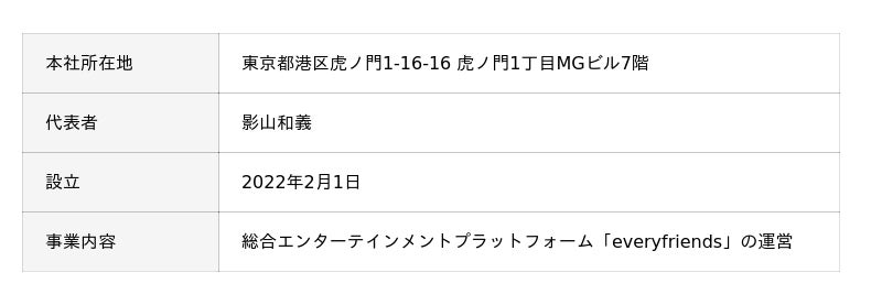 [画像3: https://prcdn.freetls.fastly.net/release_image/109280/112/109280-112-117f3bbe934a8c7e6f97bee1f205cabd-1712x320.png?width=536&quality=85%2C75&format=jpeg&auto=webp&fit=bounds&bg-color=fff ]「everyfriends」とは、動画・漫画・ゲーム・ライブコマースなどの多様なコンテンツを融合した「総合エンターテインメントプラットフォーム」です。