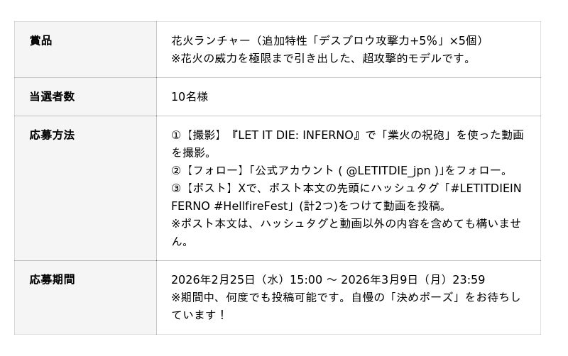 入賞したセンパイには、デスブロウ(花火)の威力を極限まで高めたゲーム内最高ランクの武器「花火ランチャー」をプレゼントいたします。