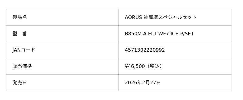 メーカー製品ページ:https://www.gigabyte.com/jp/Motherboard/B850M-AORUS-ELITE-WIFI7-ICE-P
