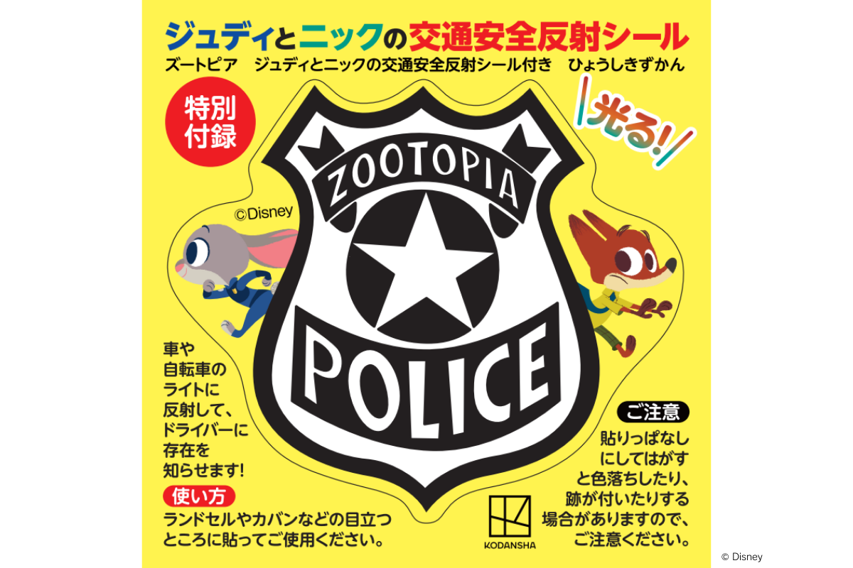 動物たちが人間のように暮らす夢の都市ズートピアには、頑張り屋なウサギの警察官・ジュディと皮肉屋なキツネの相棒・ニックをはじめ、個性的かつ人気のキャラクターたちがいっぱい。そんな多くの人々に愛される動物たちとともに日本の道路標識に親しめる『ズートピア 特別付録ジュディとニックの交通安全反射シール付き ひょうしきずかん』を、講談社より2026年3月23日(月)に発売します。