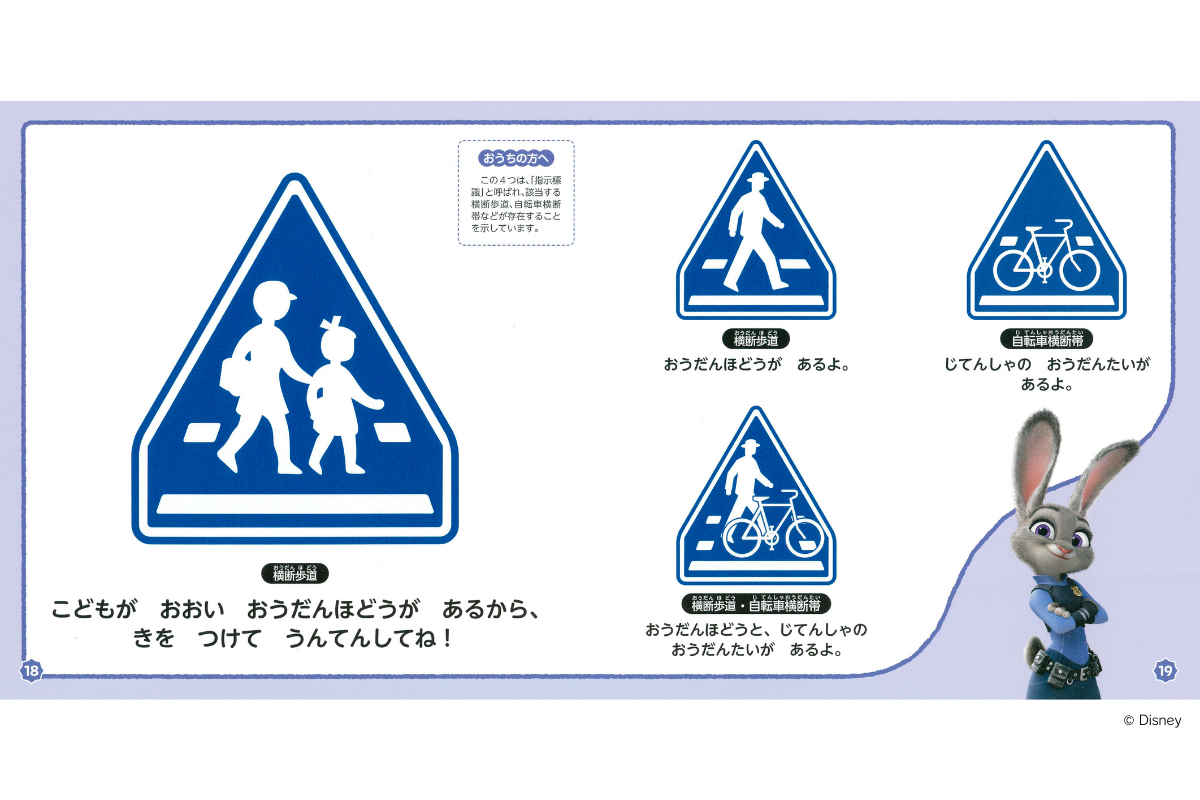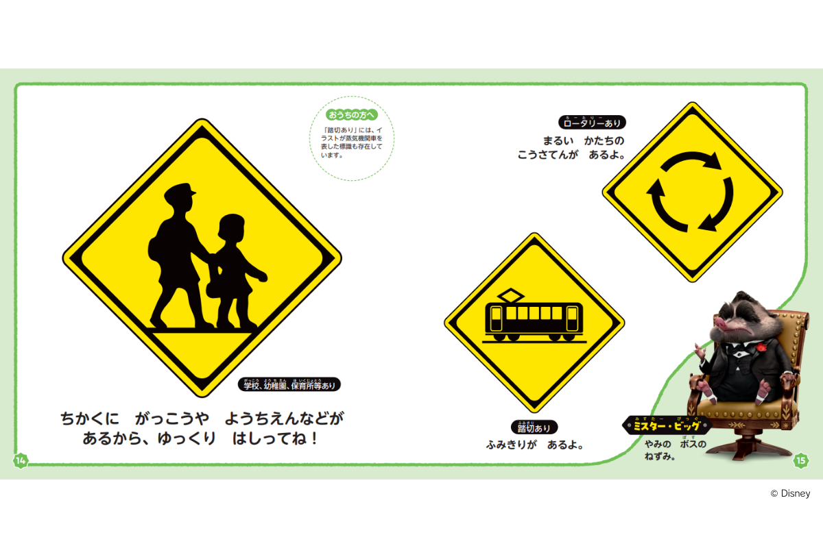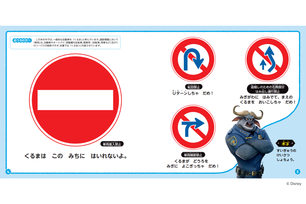 本書は、道路標識をお子さまに向けて紹介しつつ、「おうちの方へ」にはより詳しい説明を載せています。ジュディやニック、フラッシュ、クロウハウザー、ミスター・ビッグなどズートピアの動物たちが登場するので、お子さまの興味を引きやすく、自然と道路標識に親しめる内容となっています。[画像3: https://prcdn.freetls.fastly.net/release_image/1719/8167/1719-8167-92937dc5d25e2acdff0edbab8502aa15-1200x800.png?width=536&quality=85%2C75&format=jpeg&auto=webp&fit=bounds&bg-color=fff ]