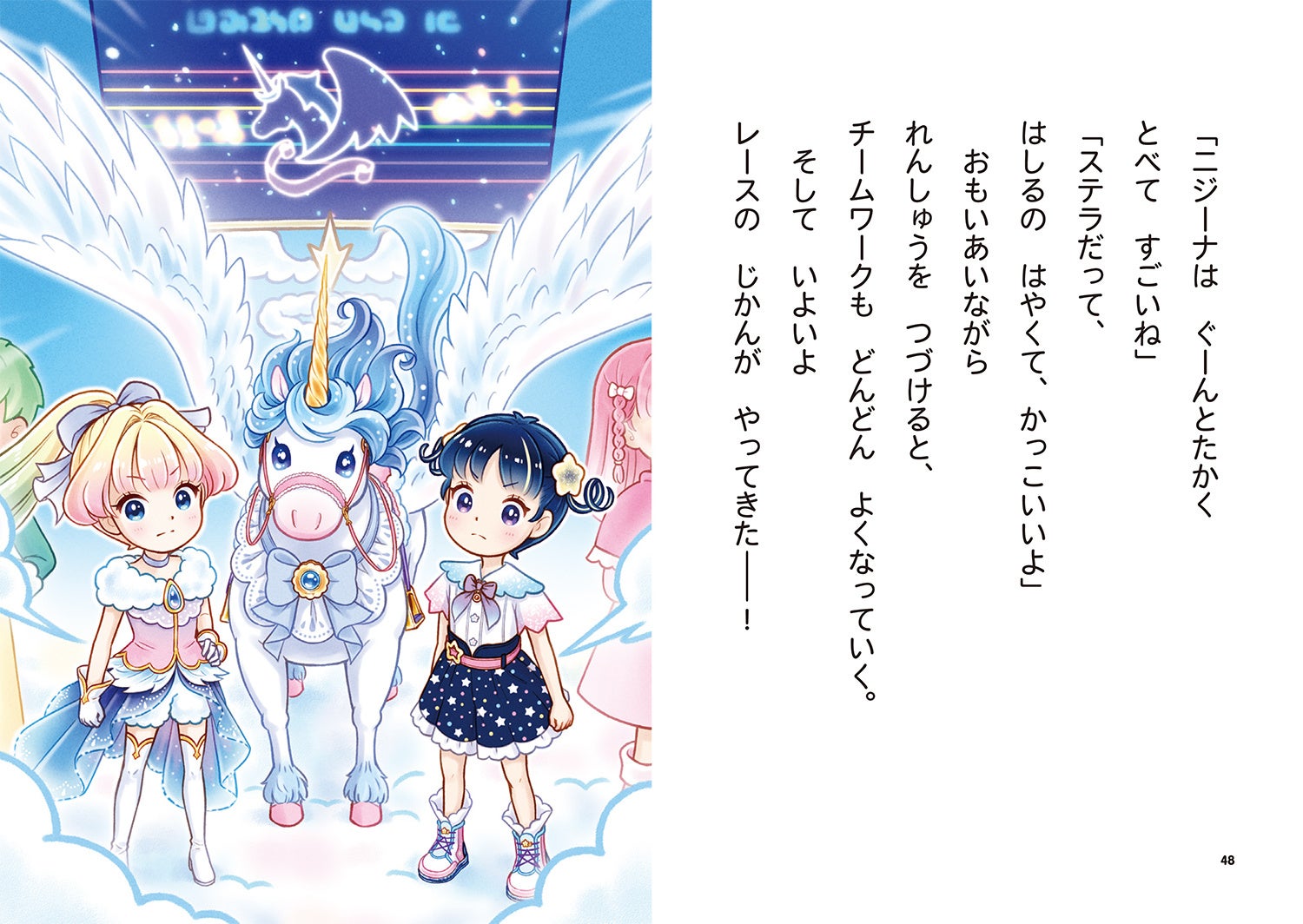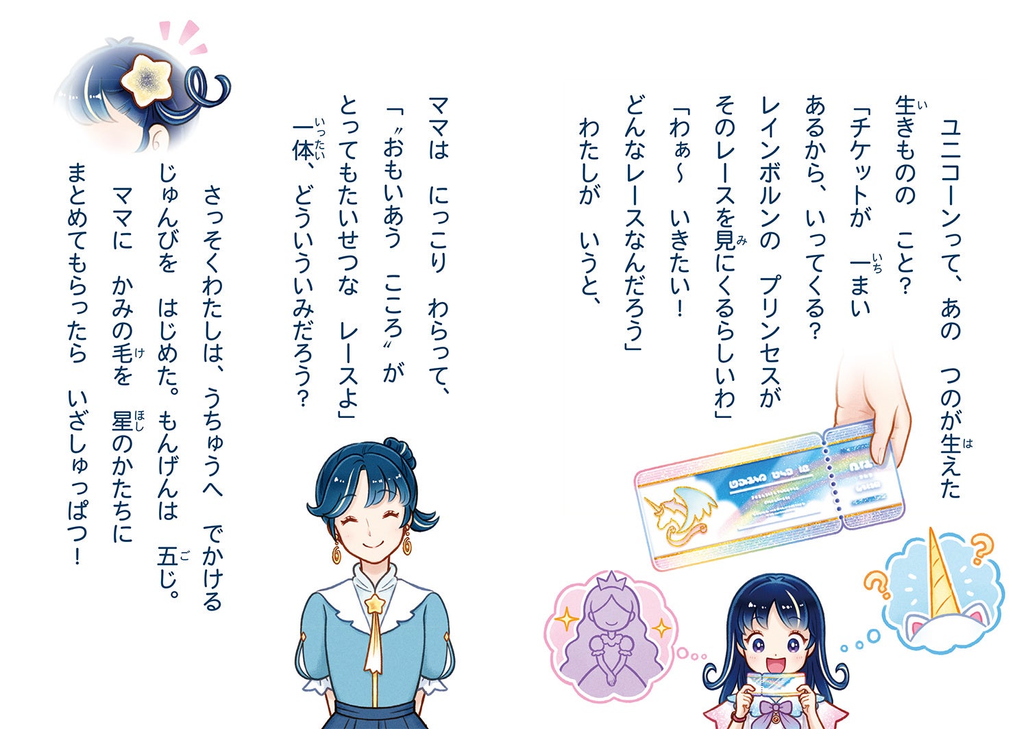 宇宙にすむプリンセス達と友達になりたいステラは次の出かけ先を探していました。すると、お母さんからユニコーンの住む星レインボルンで行われるユニコーンレースのチケットをもらいます。