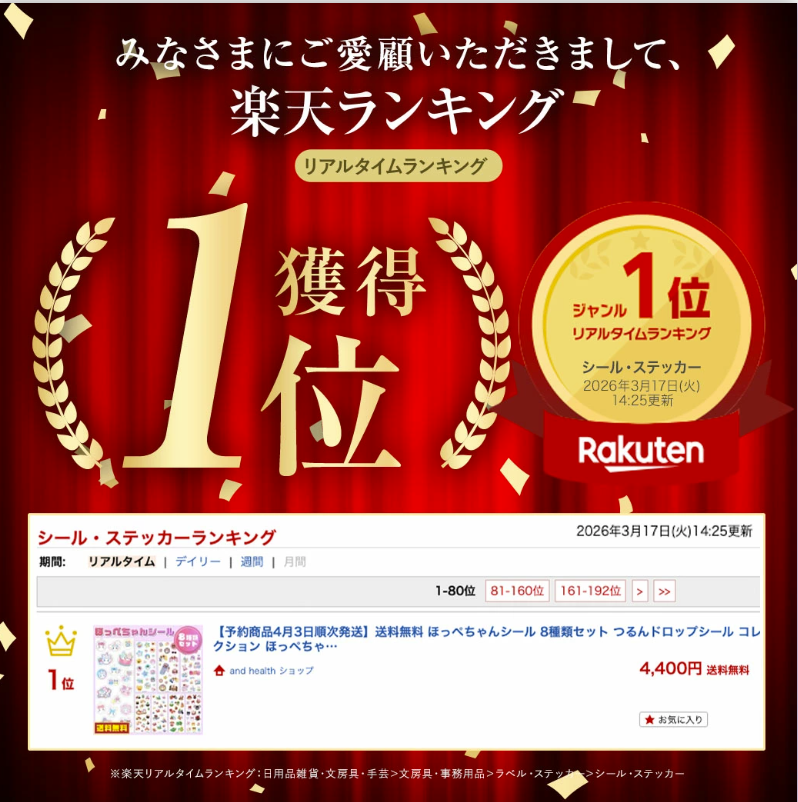 CRAVIA株式会社(本社:東京都港区、代表取締役社長:藤原宏樹、東証グロース:6573、以下「当社」)が楽天市場にて先行販売を実施した人気キャラクターIP「ほっぺちゃん」の新作オリジナルシール(全8種セット)が、2026年3月18日更新 (集計日:3月17日)の楽天市場カテゴリランキング(ラベル・ステッカー)で第1位を獲得したことをお知らせいたします。