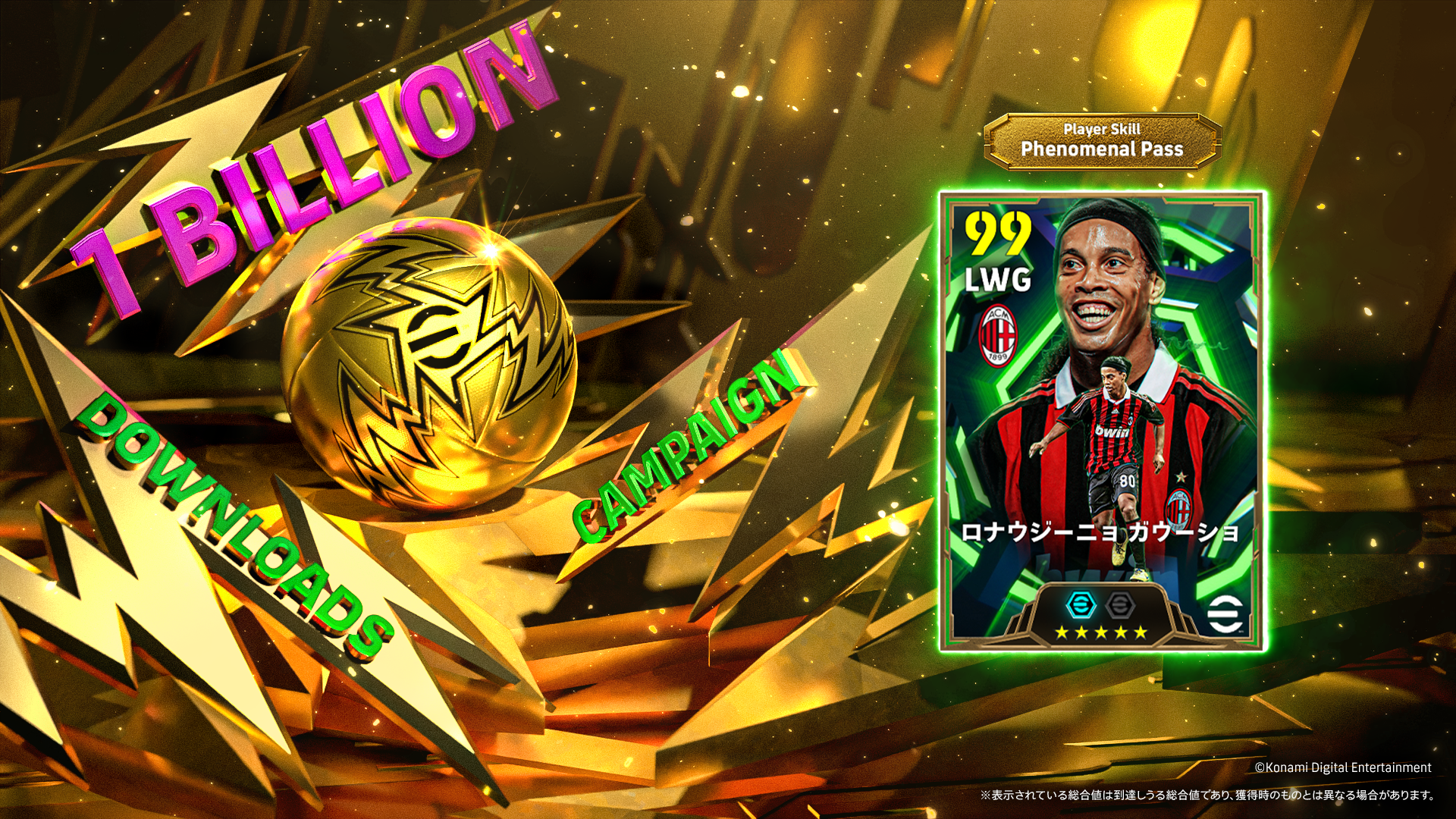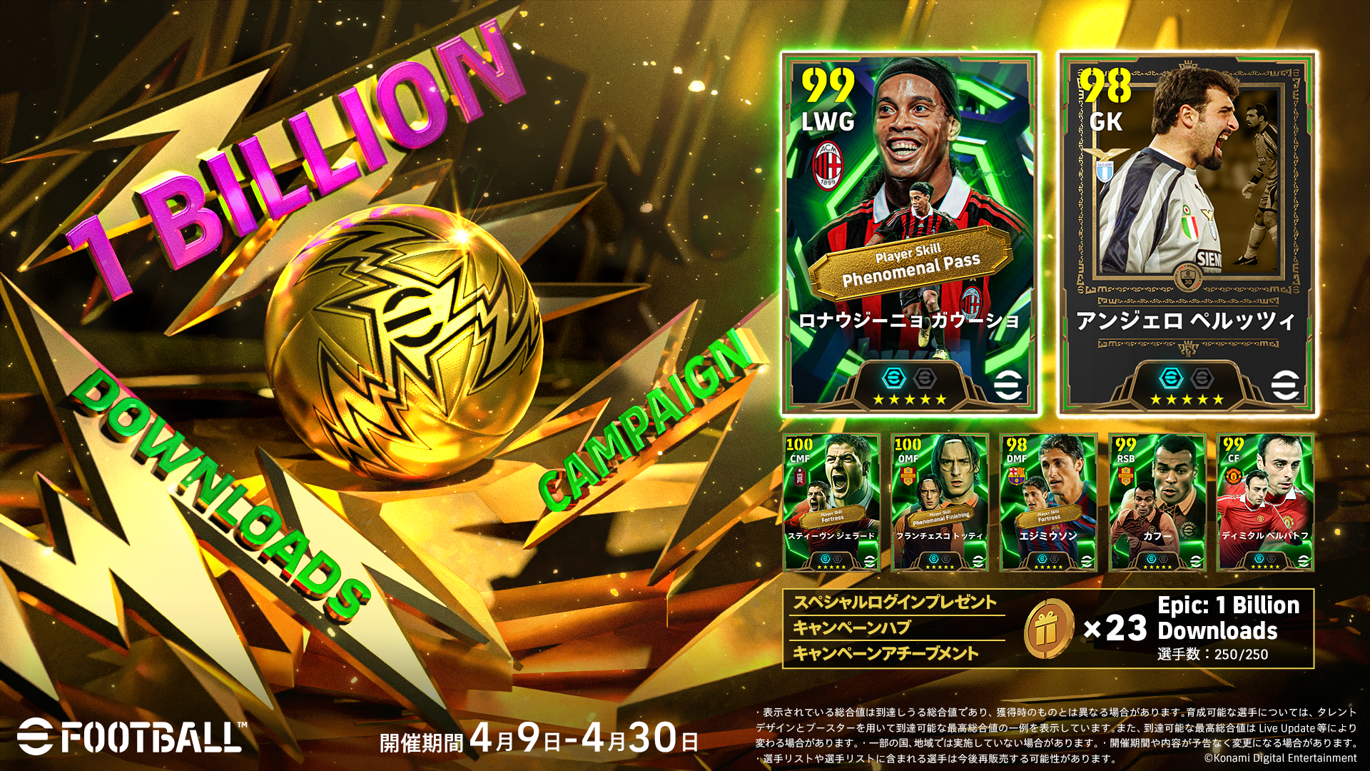 株式会社コナミデジタルエンタテインメント(以下、KONAMI)は、基本プレー無料で家庭用ゲーム機、PC、モバイルで配信中の『eFootball(TM)』が、世界累計10億ダウンロードを突破したことを記念したキャンペーンを、4月9日(木)より開始したことをお知らせします。