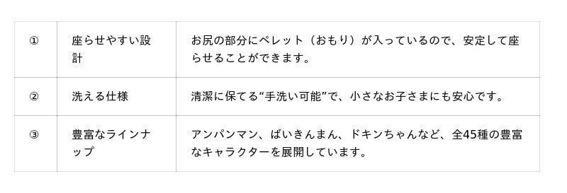 『プリちぃ★ビーンズ コレクション』は、アンパンマンに登場するキャラクター全45種を展開しており、1.5歳から楽しめるコンパクトサイズのぬいぐるみシリーズです。