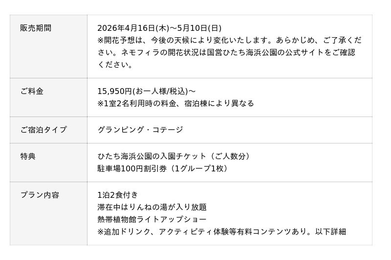 日本初の“泊まれる植物園”※1「THE BOTANICAL RESORT 林音(ザ ボタニカルリゾート リンネ)、以下:林音(リンネ)」は、春の絶景として知られるネモフィラが咲き誇る季節に合わせ、国営ひたち海浜公園のネモフィラ観光があわせて楽しめる宿泊プランの販売を2026年4月16日(木)より開始いたします。本プランは、宿泊ご人数分のひたち海浜公園の入園チケットと駐車場料金が100円割引となる特典が付いたお得な宿泊プランです。例年、首都圏から日帰りで訪れる方も多いネモフィラ観光ですが、本プランでは“泊まれる植物園”での滞在を組み合わせることで、茨城の自然や食、温泉などをゆっくり満喫できる新しい旅の形をご提案し、茨城の観光価値の向上と魅力発信に貢献します。