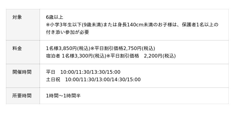 [画像16: https://prcdn.freetls.fastly.net/release_image/169987/13/169987-13-e6faadc655bc2acc1ff57847371102d6-1536x1024.png?width=536&quality=85%2C75&format=jpeg&auto=webp&fit=bounds&bg-color=fff ]大自然の中で全長150mの森の中を駆け抜ける爽快ジップラインや、木の上のアスレチックを楽しめます。(有料コンテンツ)