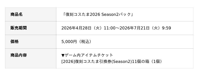 [画像3: https://prcdn.freetls.fastly.net/release_image/25063/2103/25063-2103-b67d9c2d565afba2784651831a69d4bd-780x420.png?width=536&quality=85%2C75&format=jpeg&auto=webp&fit=bounds&bg-color=fff ]「復刻コスたま2026 Season2パック」販売開始!