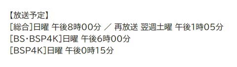 | 放送日 | 2024年1月7日~放送 日曜20:00〜20:45 |