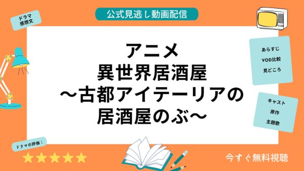 最終更新日:2024年6月26日 アニメ『異世界居酒屋~古都アイテーリアの居酒屋のぶ~』の配信動画を全話無料視聴できる動画配信サービスは「U-NEXT」が一番お得!YouTubeやTVerなど無料動画配信サイトのような広告は無しでアニメ『異世界居酒屋~古都アイテーリアの居酒屋のぶ~』を1話から最終回まで無料で一気に視聴可能です☆居酒屋という文化を知らない異世界の人々が、和食を食べた時の反応がこの作品の楽しみのひとつです。
