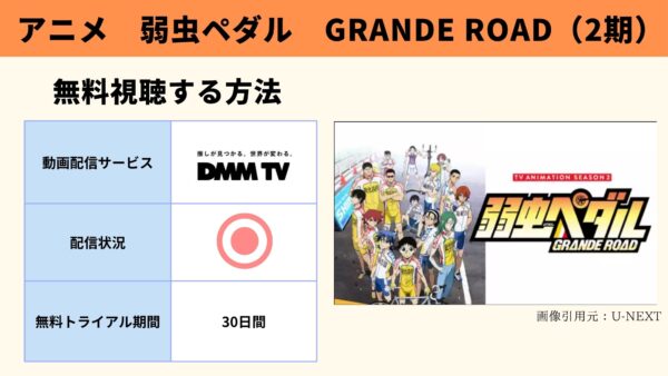結論アニメ「弱虫ペダル GRANDE ROAD(2期)」の配信動画を全話無料で視聴したいなら『DMM TV』がおすすめです!